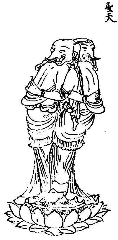 An image of Shoten in embrace with his brother Idaten (reincarnated as a female.) Image from Wikimedia Commons