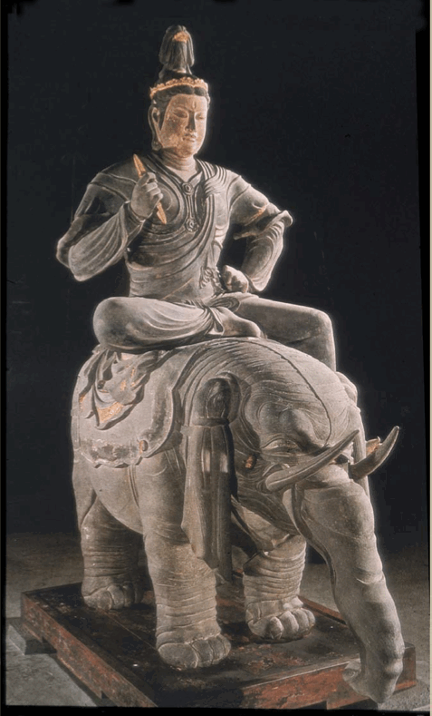 (S) Indra/ (S) Shakra / (J) Taishakuten: He not changed much from the Indian Buddhist version (which has already expunged the Hindu association with warfare.) Like Indra and Shakra, Taishakuten is the lord of storms, commands the Four Heavenly Kings, and lives atop Mt. Meru. He has even retained his elephant mount, which I imagine must have been difficult for Japanese sculptors who had never seen a photograph of an elephant. As the king of weather, he is also the commander of the Four Heavenly Kings. He also contributed to the evolution of the thunder god Raijin which will be addressed later.[12] Japanese folk tales have cited Taishakuten and his wife (Shachi) as an example of the ideal romantic couple, much like Ram and Sita are in India. [13]