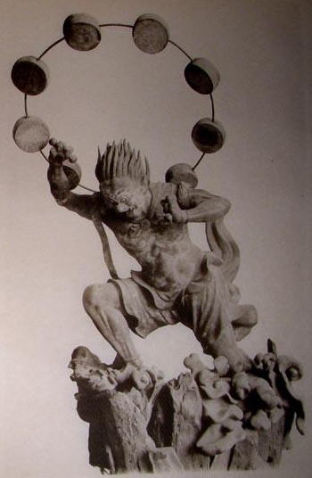 Statue of Raijin from the mid 13th century located in Sanjūsangen-dō (a temple,) in Kyoto, Japan. Image from Wikimedia Commons