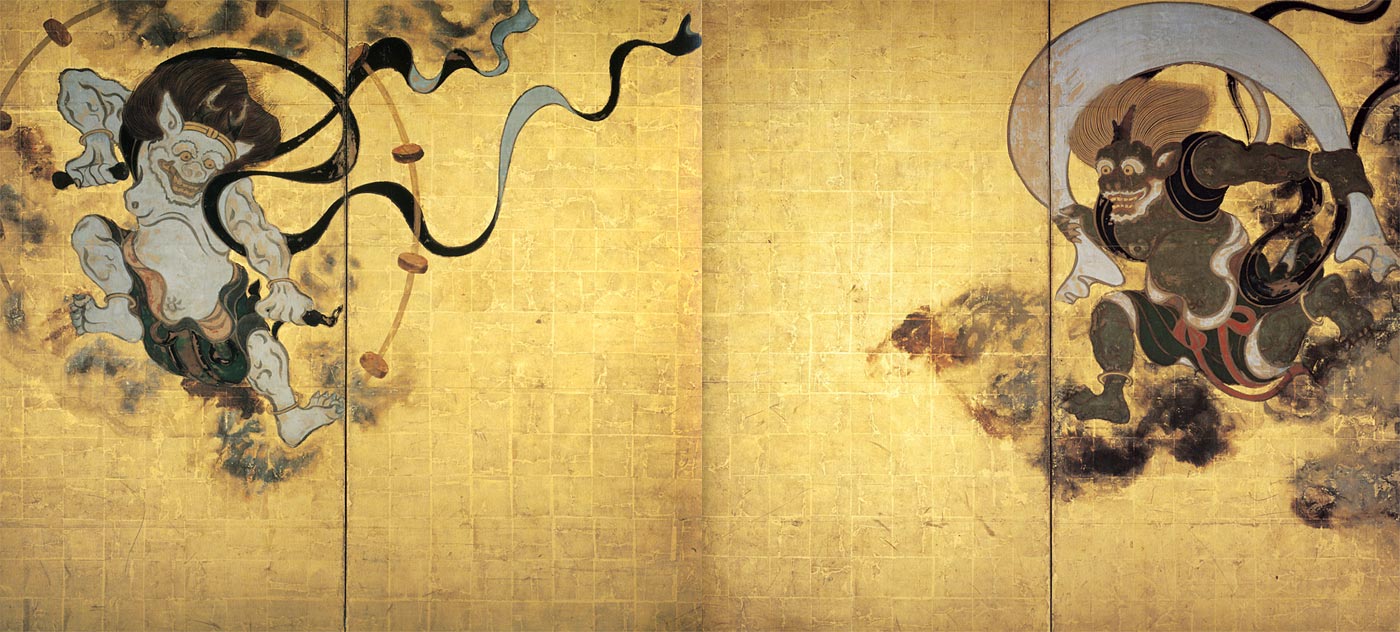 A screen of Raijin (left) and Futen (right) together. By  Tawaraya Sotatsu (1600-1640.) Located at  Kennin-ji, Kyoto. Image from Gallery Sakura