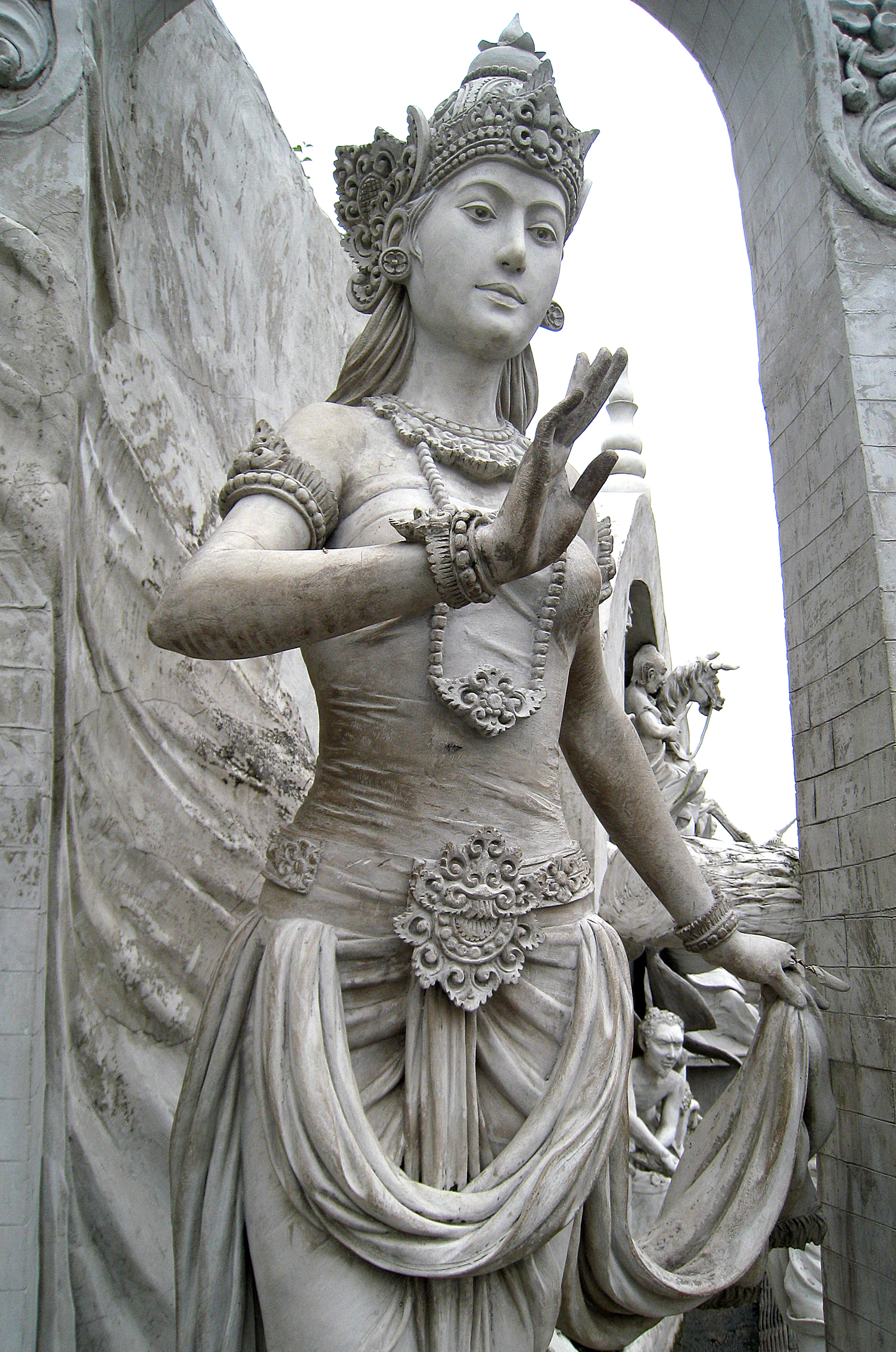 Contemporary Prithvi statue from Jakarta Indonesia. Prithvi worship fell out of fashion quickly after the Vedic period, as other mother goddesses like Lakshmi and Saraswati gained popularity. As a result, Indian Prithvi images are rare. However, in Indonesia Prithvi was adopted as “Ibu Pertiwi” and is the national personification of Indonesia, much like Bharat Mata is in India. Image from Wikipedia