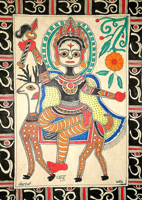 Contemporary Madhubani (Bihari folk art) style depiction of Vayu by the artists Vidya Devi and Dhirendra Jha. Image from Exotic India