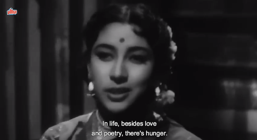 0:40:45: “Tang Aa Chuke Hain Kashm-e-Kashe Zindagi Se” –  I find this to be the most lyrically beautiful piece of the film. Vijay preforms this poem at some kind of college reunion celebration, which he reluctantly attends. This is when Meena sees him for the first time in years. Mr. Ghosh notices how his wife reacts to the poem, so he hires Vijay to learn more about their connection. The whole song strongly foreshadows the conclusion, particularly the lines “In my grief, may I not reject the entire world?” and “I can only return to life what life itself offers me.”