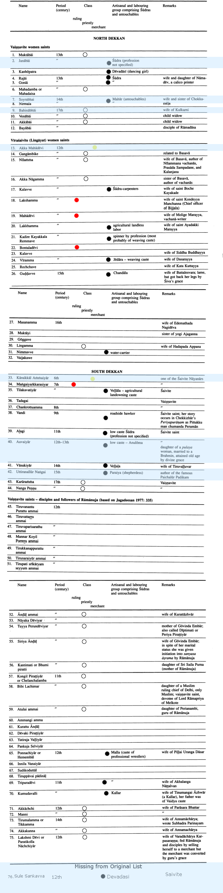 This table listing a huge sample of known female sants from the 6th to 16th centuries appears in the article “Rebels — Conformists? Women Saints in Medieval South India” by Vijaya Ramaswamy. I’ve modified it slightly to be easier to read and highlighted in blue those who appear in the above selection: