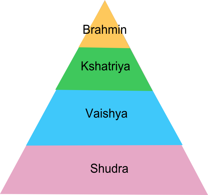 This is the way caste is taught in the vast majority of schools an universities, and it gives the incorrect impression of uniformity over time and region, and certainty about the relative positions of each caste. This is the way the British envisioned it, so the characterization stuck. Assuming the pyramid represents social stature and privilege, there should be islands of each caste further up or further down away from its main cluster. For instance, the Devadasis are classes as Shudras, but have more social stature and privilege than some unfortunate Vaishya Jatis. There should also be question mark zones representing people of contested Varna status.